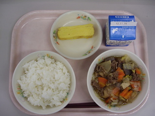 給食では「すき焼き風」というだけあって、普段食べているすき焼きに比べると、甘辛い味は控えめで、あっさりだし風味になっています。牛肉、焼き豆腐、麩、こんにゃくに加え5種類の野菜が入っていて栄養満点です。