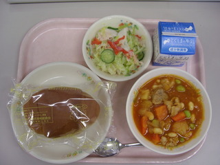 久しぶりの黒糖パンでした。今日はパンの残食が少なかったように思います。普通のパンより、ほんのり味付きの黒糖パンのほうが、子どもたちは好みのようです。ポークビーンズはコンソメ、トマトピューレとケチャップベースの洋風のおかずです。パンに合うおかずとして定着しています。