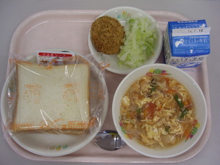 ♪セルフサンド食パン♪牛乳♪ごぼうメンチカツ・ゆでキャベツ・マヨ&ソース♪トマトスープ エネルギー757Kcal たんぱく質27.9g 脂質27.2g 耳付きの食パンのサンドイッチは食べ慣れていないため、どうしても時間がかかります。挟んで押さえてしているうちに満腹になり、今日も固い部分の耳が残ってしまいました。暑い日、酸味の効いたトマトスープはのどを通りやすかったようです。