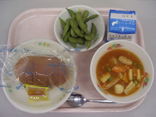 ♪小型パン♪アプリコットジャム♪牛乳♪ウィンナーのチリソース煮♪枝豆 エネルギー673Kcal たんぱく質29.9g 脂質23.3g 今日からたくさんの実習の先生が来ています。同じ給食を囲み、楽しい話をしながら、いつも以上においしい給食がすすめられたらいいなと思います。食欲を出していきたいこの時期、実習の先生の食べ方がよい刺激になることを期待します。