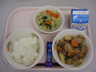 ♪米飯♪瀬戸ふりかけ♪牛乳♪肉じゃが♪すだち酢和え エネルギー743Kcal たんぱく質24.6g 脂質23.5g 肉じゃがは人気のおかずです。蒸し暑い中、よく食べていました。合わせたすだち酢和えも、さわやかな香りが食欲を増したようです。徳島の味に親しみました。