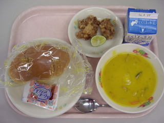 ♪パン♪いちごジャム♪牛乳♪若鶏の竜田揚げ♪すだち♪パンプキンポタージュ エネルギー765Kcal たんぱく質29.9g 脂質28.7g 食育の日。私たちがどうして食事をするのか、少しお話をしました。当たり前に、夢中で、しかたなく、あまり考えることなく毎日食事をしています。時々に、考える時間をとり、食べ物を大切に、生活を大切にしていきたいものです。