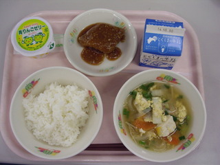 ♪米飯♪牛乳♪さわらのごま味噌がけ♪かきたま汁♪青リンゴゼリー エネルギー752Kcal たんぱく質27.9g 脂質19.3g 今日は給食試食会でした。お米のご飯を中心にして食べられる和食献立に、子どもたちに人気の青リンゴゼリーをデザートにつけました。日頃子どもたちが食べている給食を食べていただく、年に一度の貴重な機会です。ご家庭に返り、家族で今日の給食の話をぜひしていただけたらと思います。たくさんいただいたご意見は、今後の給食に役立てていきます。ありがとうございました。