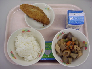 ♪米飯♪のりかつおふりかけ♪牛乳♪鮭チーズフライ♪筑前煮 エネルギー745Kcal たんぱく質30.3g 脂質21.2g 人気の鮭チーズフライと合わせて、根菜たっぷりの筑前煮を味わいました。筑前煮が苦手な子どもは、見た目が嫌なようですが、食べてみると、とても食べやすく調理されており、おいしいと言います。食べず嫌いをするのではなく、一口食べることを大切にしていきたいです。