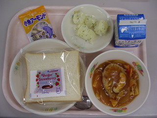 ♪食パン♪いちごジャム♪牛乳♪ハンバーグのきのこソース♪チーズ粉ふきいも♪小魚アーモンド エネルギー652Kcal たんぱく質32.8g 脂質20.8g 今日はオープンスクールの日で、たくさんの方に参観される中給食を食べました。どんな気持ちで食べていたのでしょう。土曜日給食で、いつもより少し小さめのパンが届きました。今日も食パンの耳が食べられていない子がたくさんいましたが、お家に帰るまでパワーが続いたのか心配です。