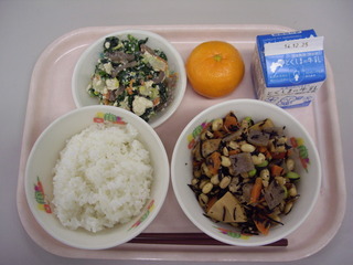 ♪米飯♪牛乳♪大豆とひじきの煮物♪ほうれん草の白和え エネルギー709Kcal たんぱく質28.8g 脂質18.4g とっても寒い日の冷たい白和えになりました。徳島産ほうれん草が甘みを出して美味しく仕上がりましたが…。食べ慣れないおかずに苦戦していたようです。昔ながらのおかず,もっと親しんでほしいです。