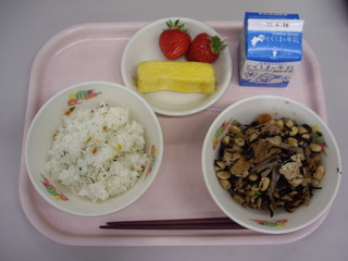 梅野菜ご飯♪厚焼きたまご♪大豆とひじきの煮物♪いちご♪牛乳♪ エネルギー706kcal たんぱく質31.0g 脂質21.3g