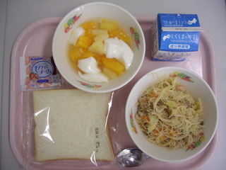 食パン♪いちごジャム♪牛乳♪焼きビーフン♪杏仁入りフルーツポンチ♪エネルギー745kcalたんぱく質27.5g脂質15.9g