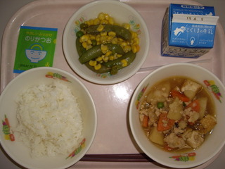 米飯♪かつおふりかけ♪牛乳♪じゃがいものそぼろ煮♪スナップえんどうの炒め物♪エネルギー687kcal、たんぱく質26.7g、脂質16.3g