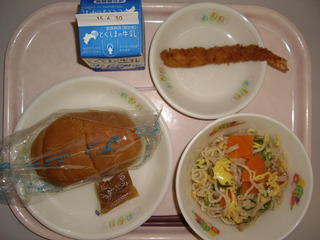小型パン♪ピーナッツペースト♪冷やし中華♪えびフライ♪エネルギー677kcal,たんぱく質26.6g,脂質17.0g