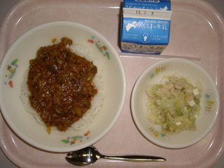 ドライカレー♪シーチキンサラダ♪牛乳♪エネルギー679kcal,たんぱく質23.3g,脂質23.1g