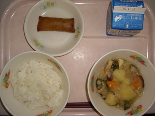 米飯♪牛乳♪厚揚げとじゃがいもの中華煮♪春巻き♪エネルギー744kcal,たんぱく質23.0g,脂質24.4g