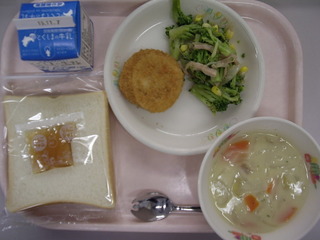 食パン♪りんごジャム♪牛乳♪根菜入りメンチカツ♪ブロッコリーのサラダ♪スイートポテトポタージュ♪エネルギー831kcal,たんぱく質28.7g,脂質25.4g