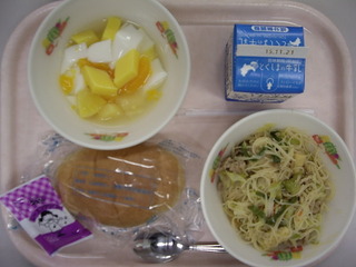 小型全粒粉パン♪レーズンクリーム♪牛乳♪焼きビーフン♪杏仁入りフルーツポンチ♪エネルギー746kcal、たんぱく質25.5g、脂質22.6g