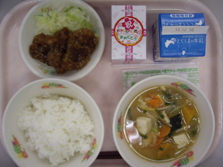 米飯♪牛乳♪豚肉のごまがらめ♪ゆでキャベツ♪みそ汁♪お祝いケーキ♪エネルギー816kcal、たんぱく質33.9g、脂質23.3g