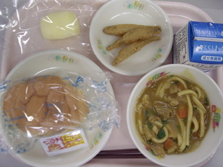 小型パン♪メープルシロップ&マーガリン♪カレーうどん♪わかさぎのフリッター♪りんご♪エネルギー830kcal、たんぱく質27.5g、脂質28.5g