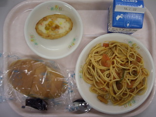 小型パン♪チョコペースト♪牛乳♪スパゲティナポリタン♪かぼちゃグラタン♪エネルギー753kcal、たんぱく質27.0g、脂質24.8g