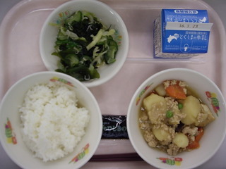 米飯♪ひじきのり♪牛乳♪じゃがいものそぼろ煮♪ちりめん和え♪エネルギー681kcal、たんぱく質27.3g、脂質15.8g