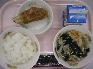 米飯♪味付けのり♪牛乳♪さわらのごま味噌かけ♪ふしめん汁♪エネルギー714kcal、たんぱく質30.7g、脂質18.5g