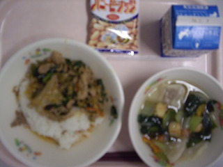 キムチ丼♪ワンタンスープ♪ハニーピーナッツ♪牛乳♪エネルギー770kcal、たんぱく質30.5g、資質23.0g