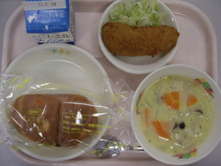 フルーツパン♪牛乳♪ささみチーズカツ♪ゆでキャベツ♪コーンポタージュ♪エネルギー764kcal、たんぱく質26.8g、脂質26.6g
