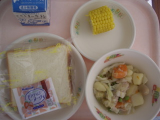 食パン♪いちごジャム♪牛乳♪洋風煮♪ゆでとうもろこし♪エネルギー707kcal、たんぱく質28.7g、脂質20.9g
