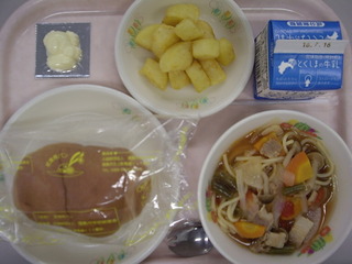 フルーツパン♪牛乳♪ミネストローネスパゲティ♪スパイシーポテト♪チーズ♪エネルギー802kcal、たんぱく質24.2g、脂質33.6g