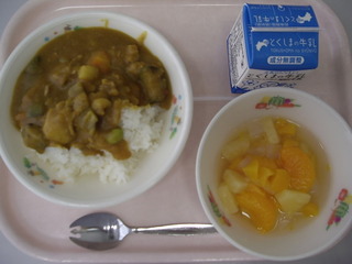 夏野菜カレー♪ナタデココ入りフルーツポンチ♪牛乳♪エネルギー767kcal、たんぱく質23.2g、脂質18.5g
