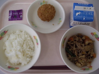米飯♪ゆかりふりかけ♪牛乳♪いも煮風コロッケ♪れんこんの炒め煮♪エネルギー727kカl、たんぱく質23.9g、脂質21.3g