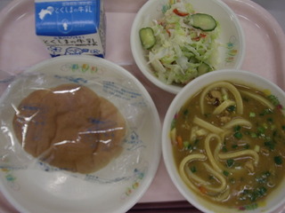 小型全粒粉パン♪牛乳♪カレーうどん♪コールスローサラダ♪エネルギー732kcal、たんぱく質26.6g、脂質22.9g