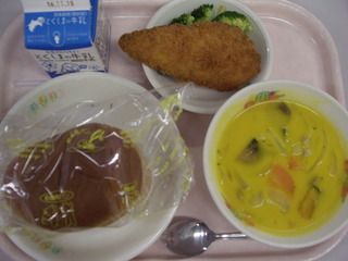 黒糖パン♪牛乳♪鮭チーズフライ♪ゆでブロッコリー♪パンプキンポタージュ♪エネルギー758kcal、たんぱく質30.4g、脂質24.2g