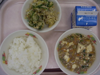 米飯♪牛乳♪マーボー豆腐♪ナムル♪エネルギー693kcal、たんぱく質30.0g、脂質21.8g