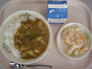 秋カレーライス(米飯)♪ヨーグルトあえ♪牛乳♪エネルギー745kcal、たんぱく質23.3g、脂質18.8g