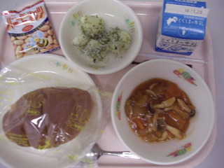 フルーツパン♪牛乳♪ミルメークココア♪ハンバーグきのこソース♪粉ふきいも♪ハニーピーナッツ♪エネルギー781kcal、たんぱく質35.1g、脂質25.6g