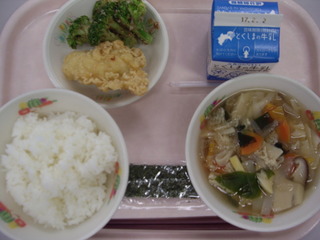 米飯♪牛乳♪はもの天ぷら♪ブロッコリーのおかかあえ♪ふしめん汁♪エネルギー679kcal、たんぱく質27.7g、脂質18.7g