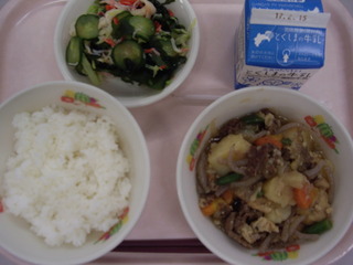 米飯♪牛乳♪肉じゃが♪酢の物♪エネルギー723kcal、たんぱく質24.5g、脂質21.7g