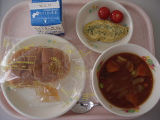 パン♪りんごジャム♪牛乳♪ビーフシチュー♪ほうれん草オムレツ♪ミニトマト♪エネルギー766kcal、たんぱく質29.9g、脂質27.1g