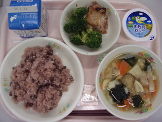 赤飯♪鶏肉の塩こうじ焼き♪ブロッコリーのおかかあえ♪ふしめん汁♪すだちゼリー♪エネルギー682kcal、たんぱく質32.3g、脂質17.1g