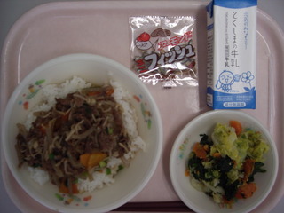 牛丼(米飯)♪すだち酢あえ♪牛乳♪エネルギー661kcal、たんぱく質27.2g、脂質18.2g
