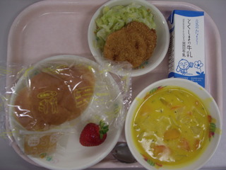 パン♪りんごジャム♪牛乳♪徳島産れんこん入りメンチカツ♪ゆでキャベツ♪パンプキンポタージュ♪いちご♪エネルギー765kcal、タンパク質27.9g、脂質25.5g