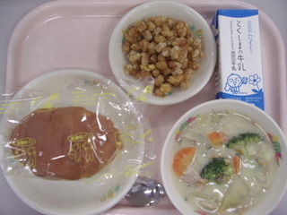 フルーツパン♪牛乳♪あさりのチャウダー♪カレービーンズ♪エネルギー687kcal、タンパク質26.4g、脂質24.9g