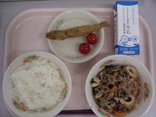 米飯♪牛乳♪れんこんの炒め煮♪子持ちししやもフライ♪ミニトマト♪エネルギー691kcal、タンパク質25.1g、脂質19.1g