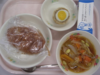 きなこ揚げパン♪牛乳♪スコッチエッグ♪ミネストローネ♪エネルギー733kcal、タンパク質25.3g、脂質29.2g