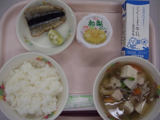 米飯♪牛乳♪さんまの塩焼き♪すだち♪けんちん汁♪梨ゼリー♪エネルギー695kcal、タンパク質26.1g、脂質22.3g
