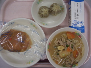 小型キャロットパン♪牛乳♪味噌ラーメン♪多彩包子♪エネルギー740kcal、タンパク質28.3g、脂質23.1g