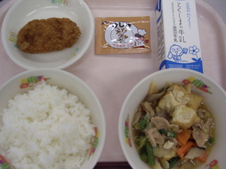 米飯♪ひじきふりかけ♪牛乳♪厚揚げと豚肉の味噌煮♪えびカツ♪エネルギー711kcal、タンパク質32.9g、脂質20.5g