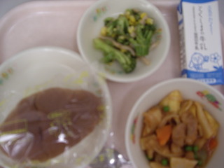 黒糖パン♪牛乳♪豚肉とさつまいものケチャップ和え♪ブロッコリーのサラダ♪エネルギー778kcal、タンパク質28.6g、脂質24.3g