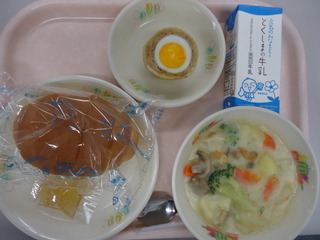 小型パン♪りんごジャム♪牛乳♪えびと花野菜のクリーム煮♪スコッチエッグ♪エネルギー702kcal、たんぱく質28.0g、脂質18.5g