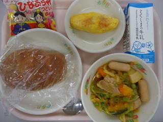 きなこ揚げパン♪牛乳♪洋風煮♪トマトミートオムレツ♪エネルギー801kcal、たんぱく質32.3g、脂質28.7g