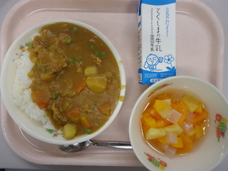 カレーライス(米飯)♪ナタデココ入りフルーツポンチ♪牛乳♪エネルギー704kcal、たんぱく質26.2g、脂質22.0g
